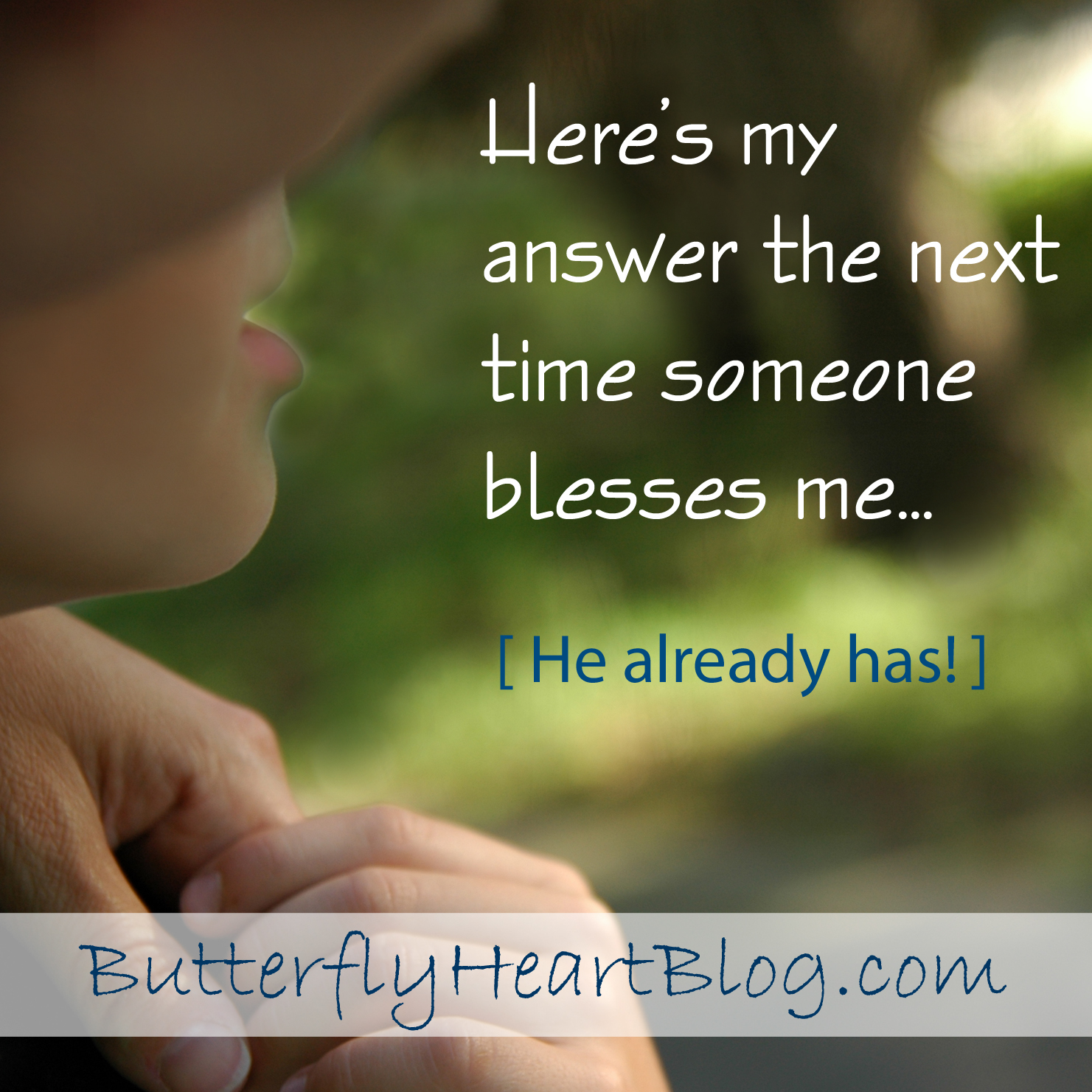 So while we normally have an automatic response to someone blessing us by returning the same words without even thinking, I’m glad this stranger caused me to stop and really consider those words. And discover a new answer.